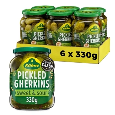 Crunchy pickled gherkins in a savoury infusion with fine herbs No artifical colours or preservatives Gluten and lactose free Vegan and Vegetarian friendly 6 x 300g Directions: Store in a cool dry place. Once opened, keep refrigerated and immersed in bring. Consume within 2 weeks of opening. Ingredients : Gherkins, water, spirit vinegar, sugar, salt, dill, onions, bell pepper, seed, natural flavoring. Safety warning: Store in a cool dry place. Once opened, keep refrigerated and immersed in bring. Consume within 2 weeks of opening. Country string: Germany. Specialty: suitable_for_vegans; Allergen information: mustard Ingredients : Gherkins, water, spirit vinegar, sugar, salt, dill, onions, bell pepper, seed, natural flavoring