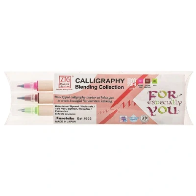 ZIG CALLIGRAPHY pens are a water-based pigment, dual tipped pen, great for beginners. They are acid-free and photo safe. Our square tips are ideal for both right and left handed users. Item ZIG MEMORY SYSTEM CALLIGRAPHY 3 colors set Blending Collection Package Dimension 185x17x55 mm 7.28x0.67x2.17 in Product Features Waterproof / Archival Quality / Ideal for Scrapbooking and other crafts TIP SIZE: 2 mm & 5 mm Contents INK TYPE: Photo-Safe, Acid Free, Lightfast, Odourless, Xylene Free Ink Type water-based pigment Country of Origin JAPAN KUMS-3400-3VGI MPN MS-3400/3VGI