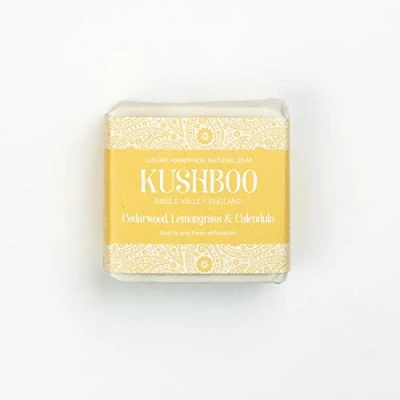 This delicious, fresh soap contains Cedarwood essential oil making it perfect to reduce skin irritations and acne due to its antiseptic properties. The oil can also help tighten the skin to give a youthful appearance Blended with the zingy citrus oil of Lemongrass and finished with Calendula petals for their plant-based antioxidants to protect the skin. 100% Natural, Vegan, Made in England, Suitable for all skin types All Kushboo products are free from Sodium Lauryl Sulphate, Parabens, Preservatives or chemicals. We are proud to be Plastic Free and Cruelty Free. We use ethically sourced ingredients including RSPO Certified Sustainable Palm Oil Kushboo Mission Statement - We believe soap is dignity - a basic commodity that should be available to all. For every soap we sell, we donate another to Food Banks and the homelessness, helping vulnerable people get back on their feet Order any 6 soaps and get a £10 saving in your basket. Our soaps are suitable for all skin types