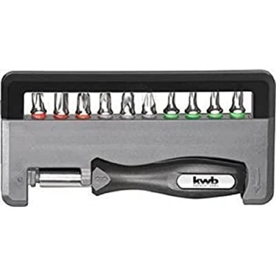 The practical bit holder with magnetic holder fits in any shirt or host pocket. A folding shackle secures the bits from falling out and can be easily opened to remove the bits. The following bits each 25 mm length with colour coding are included: 1x PH 1, PH 2, PH 3, PZ 1, PZ 2, PZ 3, T 10, T 15, T 20 and T25. The screwdriver set can be used for all common cordless screwdrivers from brands such as Bosch, Milwaukee, DeWalt, Metabo, Makita and much more. can be used., Weight: 0.3086471668 pounds, Manufacturer: kwb Germany GmbH