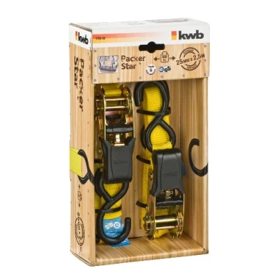 STRAPMABLE POLYESTER TAPE: The lashing strap with hook can withstand loads of up to 500 daN (kg) when strapped and up to 250 daN (kg) when lashed in tension. TÜV / GS TESTED: These ratchet lashings are TÜV / GS tested and guarantee maximum safety through independent testing. WITH TEST SIGN: Only lashing straps with a recognisable and attached test sign may be used in public traffic to ensure the safety of other road users. PLASTIC COATED RATCH: The ratchet of the kwb lashing strap has a plastic coating that provides protection against sharp edges and ensures improved force transmission. WITH COMFORT RELEASE: The comfort release makes it easier to release the lashing strap with ratchet compared to normal full metal ratchets. WITH HOOK: With the help of the hooks, the ratchet lashing straps can be attached to lashing recesses or eyelets of cars, vans and roof boxes to fix and secure loads.