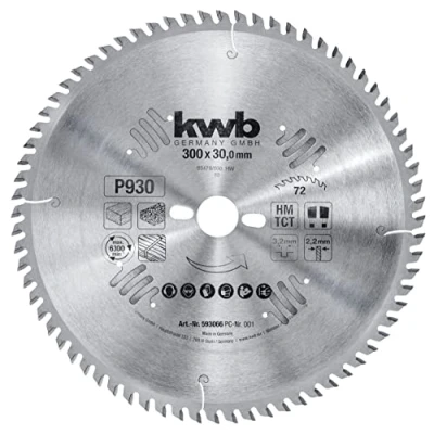 SUPERIOR PRECISION: High tooth count delivers an ultra-fine cut, crucial for visible surfaces like countertops, coated panels, and HPL sheets. ALTERNATING TEETH: Carbide-tipped teeth with alternating bevel ensure optimal chip clearance and efficient material removal. RE-SHARPENABLE: "Made in Germany" quality and premium carbide allow the blade to be resharpened 6-8 times under proper use. HIGH-QUALITY FINISH: Polished base and sandblasted tooth edge reduce friction, enabling smoother operation compared to non-polished blades. VERSATILE MATERIALS: This precise blade effortlessly cuts fiberglass-reinforced plastics, soft and hardwood, laminates, MDF, and more., Weight: 2.90789723578 Pounds, Manufacturer: kwb