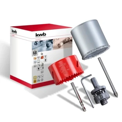FOR PLUG AND SWITCH BOX INSTALLATION: The 6-piece installation set for the installation of plug and switch boxes contains two centring drills and drill bits each for different materials as well as a mounting shaft and a hexagonal spanner. GOOD CUTTING PERFORMANCE: The vario-toothing of the HSS bimetal hole saw for wood with a cutting depth of 38 mm enables a very good cutting performance and precise holes. LONG SERVICE LIFE: The kwb hole saw for metal with a cutting depth of 64 mm, even in hard material, is sprinkled with high-quality carbide for a long service life. 68 MM STANDARD DIMENSION: The drill bit set for tiles in the standard dimensions of 68 mm for junction and cavity wall boxes and the centre drill bits work their way effortlessly into all common interior finishing materials with robust HSS and carbide., Weight: 1.63803460666 Pounds, Manufacturer: kwb
