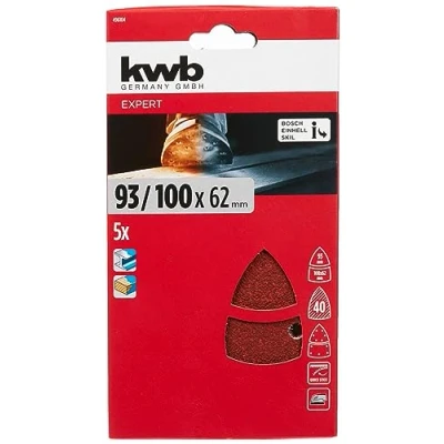 EDEL CORUNDUM SANDING GRAIN Grit: The grit of the abrasive papers for multi-sander is made of precious corundum, which enables extra strong removal of high-quality and elastic paint layers. TOOLLESS CHANGE: To change the sandpaper quickly and easily, the Delta sanding triangles are equipped with a velour back for attachment to adhesive support plates with Velcro system. SYNTHETIC RESIN BONDING: Even under high loads, the abrasive grit on the paper backing has extreme durability due to the high-quality synthetic resin bonding of the abrasive. REINFORCED PAPER SUPPORT: For a long service life, the kwb sandpaper has a reinforced paper support that is stable, flexible and tear-resistant, thus delivering perfect sanding quality even on demanding surfaces., Manufacturer: KWB