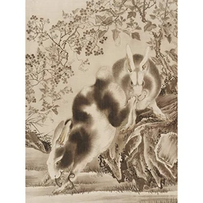 Kyosai Zwei Kaninchen Baum Japanische Malerei Premium Wandbild Leinwand Druck 45,7 x 61 cm