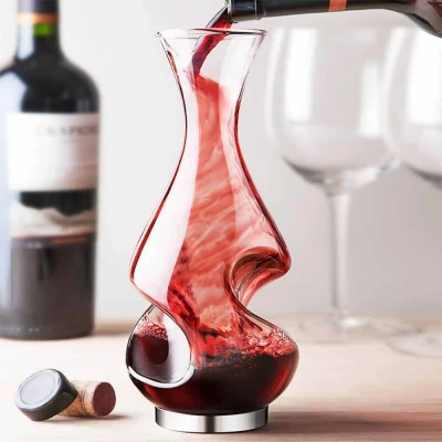 The unique design helps to enhance both. Aerates wine when filling or serving Pouring in or out, the curves of this decanter gently disperses the wine providing superior aeration & oxygenation. 2 Phase Aeration Process: Phase One: The process begins by pouring the wine into the decanter. The wine travels strategically down and over the sides of the decanter, providing superior aeration and oxygenation Phase Two: When serving, the wine is gently dispersed over the specially designed curves providing a second aeration phase which maximizes the scent and flavour of the wine. Elegant brushed stainless steel base. Includes: One Decanter. Capacity: 750ml (25.4 oz)