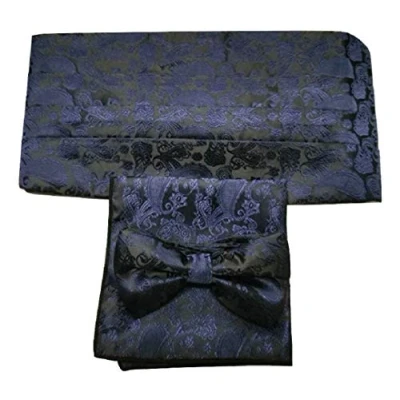 L&L® 3 Pcs Satin Paisley Matching Cummerbund + Bow Tie Pocket Square Set (Navy)
