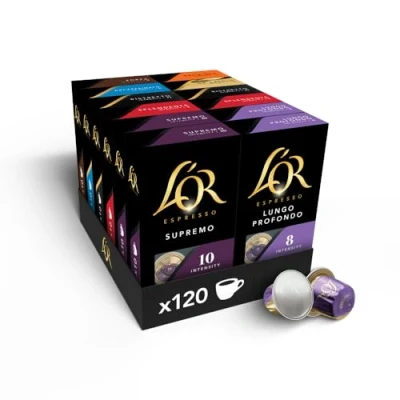 A VARIETY OF 8 FAVOURITE L'OR blends, created to immerse your senses with layers of complex, subtle and intense flavours, a captivating pleasure created just for you. ENJOY 120 RECYCLABLE CAPSULES - designed from aluminium to preserve the exceptional taste and aroma of our distinctive espresso range. Every capsule contains 100% Common Grounds certified coffee, sourced from sustainable farms with a focus on quality and ethical practices. Compatible with L'OR BARISTA and Nespresso Original coffee machines*. *Registered trademark of a third party, unrelated to JACOBS DOUWE EGBERTS