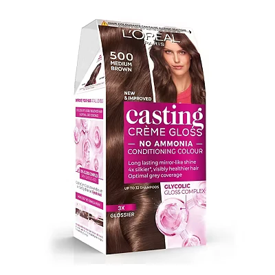 LOréal Paris Casting Crème Gloss 500 Light Brown is a no-ammonia hair color that delivers up to 3x glossier, 4x silkier hair while covering first grey hairs naturally. With a new Glycolic Gloss Complex, it conditions and shines for up to 32 washes.