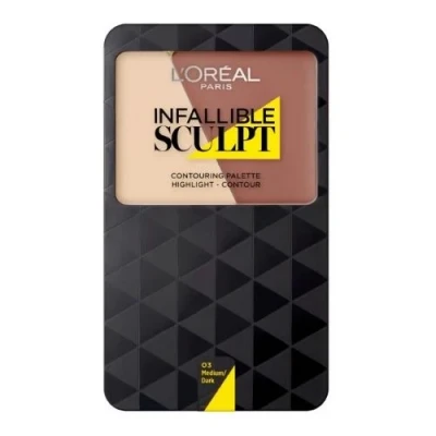 Perfectly sculpt your face in seconds with this L'Oreal Infallible Sculpt Palette. This contouring and highlighting cream to powder formula will work to define and enhance features and the pro-sculpt brush will give you a professional finish.. The lighter shade is designed to lift and highlight the high-points of your face, whilst the darker shade creates the illusion of shadow, to sculpt your face to perfection.. Our innovative cream-to-powder technology is easy to apply and super blendable. Your sculpted finish looks true-to-skin, with a flawless matte finish.. 1 x L'Oreal Infallible Sculpt Palette Medium 03. Contouring and highlighting. Pro-sculpt brush included
