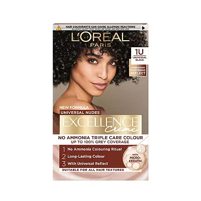 L’Oréal Paris Ammonia Free Permanent Hair Dye, 1U Universal Black, Complexion Flattering Reflects, Up to 100% Grey Coverage Colour, All Types, Excellence Crème Nudes, 1 Application