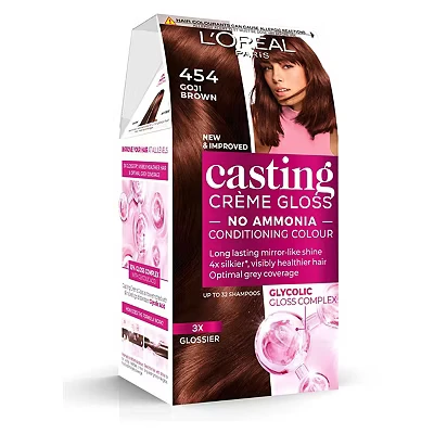 Introducing new formula with 10% Glycolic Gloss Complex for glossy, intensely conditioned & low-commitment colour Enjoy up to 3x more gloss, up to 4x silkier and visibly healthier hair for up to 32 shampoos Follow packet instructions and do a patch test 48 hours before use, Mix color and developer wearing gloves, Apply mixture and leave on as directed, Condition and rinse Ammonia-free conditioning colour for gentle, vibrant results Contents: 1x L'Oréal Paris Casting Crème Gloss, Semi-Permanent Hair Dye, Radiant & Natural Colour, Shade: Goji Brown 454