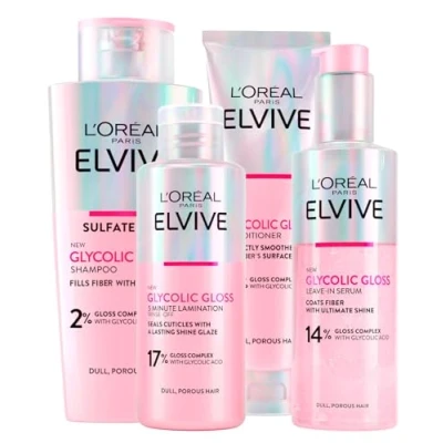 L'Oréal Paris Elseve Elvive Glycolic Gloss 150ml Conditioner + 200ml Shampoo No Rinse Serum 5 Minute Laminating Treatment for Dull and Porous Hair 4 bottles