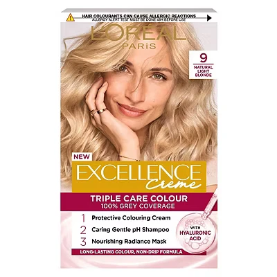 LOreal Excellence 9 Natural Light Blonde Permanent Hair Dye offers a triple care ritual: a caring colouring cream, gentle scalp shampoo, and lightweight mask for nourished, grey-covering results. Formulated to protect hair and scalp, it delivers natural, multi-tonal blonde tones with lasting vibrancy.