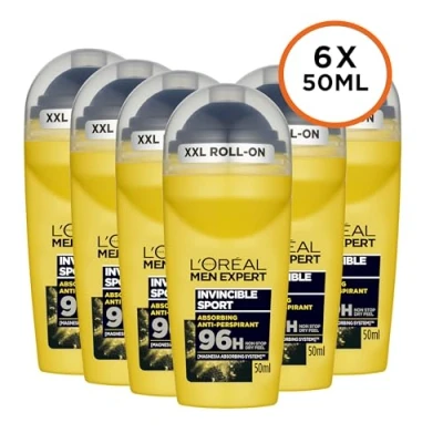 L'Oréal Paris Men Expert 96H Invincible Sport Anti Perspirant Roll On Deodorant for Men, 50ml Pack of 6, Bulk Buy