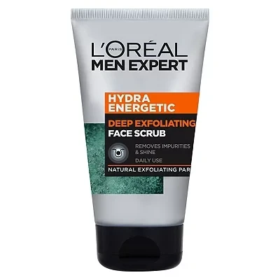 LOreal Men Expert Hydra Energetic Deep Exfoliating Face Scrub 1ml deeply cleanses skin with natural particles, removes impurities and shine, unblocks pores, and refreshes with peppermint extract for a revitalized feel. Use daily for smoother, clearer skin.