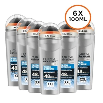 L'Oréal Paris Men Expert Fresh Extreme 48H Roll On Deodorant XXL, Anti Perspirant, Ultra Absorbent Technology, Combats Sweat & Body Odour For 48 Hours, 6 X 100ml
