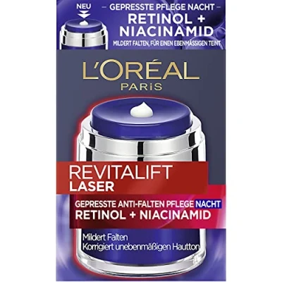 Pressed anti-ageing night cream in hygienic jar, with wrinkle-reducing retinol and brightening niacinamide, for a smooth and even complexion Result: visibly reduced wrinkles and a plumped, firm complexion, lightened pigment spots and a nourished, radiant complexion Directions for use: week 1: apply the care on two evenings, week 2: apply the care every second evening, week 3: apply the care every evening Reduced wrinkles and a smoother complexion in just 14 nights, applying SPF 20 sun protection the next morning after application Box contents: L'Oréal Paris pressed anti-wrinkle night cream with retinol and niacinamide for an even complexion, 1 x 50 ml