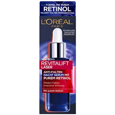 Anti-ageing serum for the night with highly concentrated formula, for 3x more retinol in the deeper skin layers to reduce wrinkles, suitable for all skin types Result: The formula with retinol reduces signs of ageing such as wrinkles and an uneven complexion - for younger looking skin and stimulated cell regeneration Application: In the evening before moisturising, 3-4 drops on the cleansed face, in the 1st Week only 2 nights/week, slowly increase over the next 3 weeks Powerful formula of pure retinol (a very effective form of vitamin A) to reduce deep wrinkles, additionally enriched with natural hyaluronic acid for rehydration and smoothing and a light oil for skin care Box contents: 1 x L'Oréal Paris Revitalift laser anti-wrinkle serum for the face with pure retinol, 30 ml