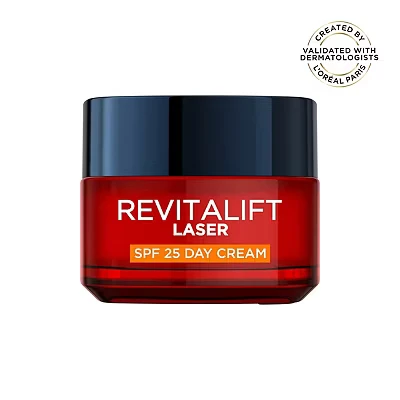 L'Oréal Paris Revitalift Laser Triple Action SPF25 Cream is an anti-ageing day cream with Pro-Retinol, Hyaluronic Acid, and Vitamin C, designed to smooth wrinkles, firm skin, and reduce dark spots while providing SPF 25 protection. Suitable for all skin types, including sensitive skin.