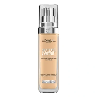 Liquid and melting foundation, adjustable coverage and even application to hide imperfections without a mask effect, suitable for sensitive skin Results: Skin hydrated for 24 hours, improves skin quality from 2 weeks**, uniform and even complexion, natural coverage without chipping, available in 48 tailored shades Application: Shake before use, use a brush or beauty mixer as a complement to Accord concealer care, perfect for a complete and perfected routine Glass bottle, with hyaluronic acid, skin matching technology with up to 6 pigments for a perfectly matched result to skin tones, non-greasy texture, non-comedogenic, dermatologically tested Contents: 1 x L'Oréal Paris Accord Liquid Foundation, Color: Natural Gold (4.D), Capacity: 30 ml"