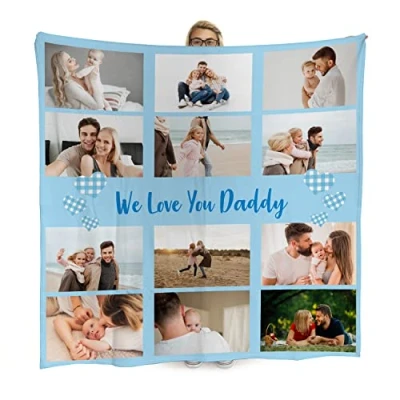 L&S PRINTS Extra Large Personalised Blue Gingham Heart Photo Blanket Custom Fleece Throw Picture Collage Dementia Gift Made in England