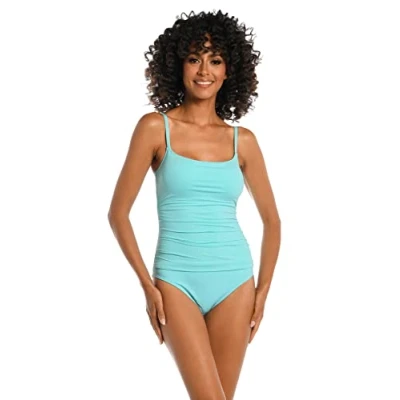 FIT AND COMFORT - This one piece swimsuit offers a sleek and firm fit, with shirred seams that subtly conceal areas of concern, creating a lean, sculpted appearance. Its shoulder straps and comprehensive back coverage provide a secure swim experience. SIZING - Runs true to size. Please refer to our Size Chart for specific measurements to achieve the perfect fit. Plus sizing available. FEATURES AND DETAILS - Thin over the shoulder, adjustable straps. Sleek scoop neckline. Straight back. Removable cups. Lined. Side and midsection shirring detail. High-cut sides, and full coverage bottom for a secure fit. CARE AND USE - Hand wash only. Rinse in cold water after each use to remove chlorine, salt, or lotions. Allow to dry naturally, away from direct sunlight. Avoid the use of bleach and fabric softeners to preserve the fabric's elasticity and color. COMPLETE THE LOOK - Elevate this solid one-piece with board shorts or a chic cover-up from the Island Goddess collection, for an effortlessly polished look that transitions seamlessly from beach to boardwalk.