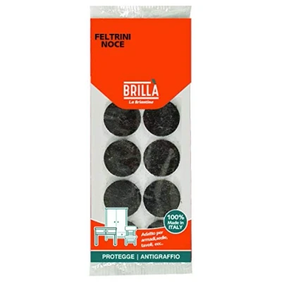 The round walnut gliders are 8 perfect self-adhesive felt pads to prevent noise when moving and protect furniture and floors from abrasion or grooves Scratch resistant and self-adhesive, ideal for cabinets, chairs, tables and other furniture and furniture in your home Box contents: 8 pieces Dimensions: diameter 2.6 cm; height 2 mm; colour: walnut; shape: round Composition: felt gliders 100% polyester, adhesive 100% Hotmelt