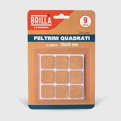 Square cork gliders are 9 perfect self-adhesive cork pads that help prevent noise from moving and protect furniture and floors from marks of abrasion or scuffing Scratch resistant and self-adhesive, ideal for cabinets, chairs, tables and other furniture and furnishings in your home Package: 9 pieces Dimensions: 2.5 x 2.5 cm; Height 1.5 mm / Colour: Cork / Shape: Square Composition: felt 100% cork, glue 85% water, 6% polyvinyl alcohol, 5% calcium carbonate, 4% polyacrylate