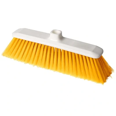 Flat broom for professional use certified H.A.C.C.P. Non-toxic material, can be sterilised at high temperatures (134 °C) and resistant to chemicals, colour coded yellow White slat made of extruded virgin polypropylene, size 280 x 52 mm Smooth and soft bristles made of polybutylene terephthalate (PBT), cut 170 - diameter 0.33 mm Rust-proof galvanised iron bristle attachment hooks Suitable for professional and household mechanical cleaning in areas with medium risk bacterial contamination such as laboratory floors, gyms etc. Handle attachment with universal thread, Manufacturer: La Briantina
