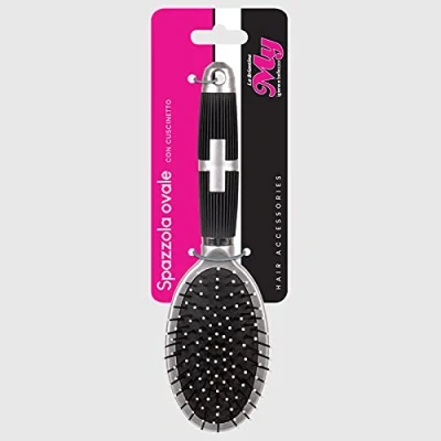Oval Hair Brush with Air Cushion Ideal for detangling smooth and wavy hair without irritating the scalp The plastic bristles with rounded head, are mounted on a pneumatic pad that cushions the action on the skin and creates a beneficial massage Colour: silver grey Material: Body 100% Polypropylene, Bristles 100% Nylon, Bearing and Handle 100% Thermoplastic Rubber