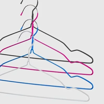 Space-saving clothes hanger set for wardrobe, made of rubberised steel. Pack of 4 Non-slip and non-slip thanks to rubberised coating Width of hangers: 40 cm Random color: black, fuchsia, blue or white. The product image is for illustration purposes only. The colour of the item may be different Composition: plastic-coated metal