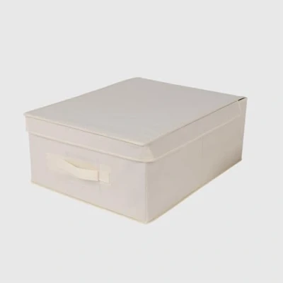 Dust and moisture protection - The integrated lid protects the contents, keeping it clean and dry all the time. EASY TO REMOVE - Equipped with handy front handle for convenient movement in and out of the cabinet. Robust materials - Inner frame made of hard cardboard and outer cover made of durable and breathable TNT. ALWAYS Identifiable Contents - Label pocket to recognize what's inside at a glance. SPACE SAVING SIZE - Measures 30 x 40 x H13 cm, ideal for cabinets, shelves or walk-in closets. Random Color (Grey or Beige)