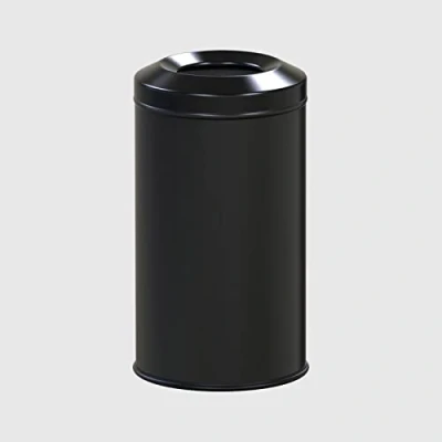 Steel trash bin with organic powder coating, smooth black finish (RAL 9005) Thanks to the special lid design, this container has self-extinguishing characteristics, reduces oxygenation inside and prevents the spread of flames Simple and elegant design, suitable for placing anywhere Anti-slip rubber base, ensures protection to the support surface and prevents unwanted movement Dimensions: ø 24 x h 43 cm