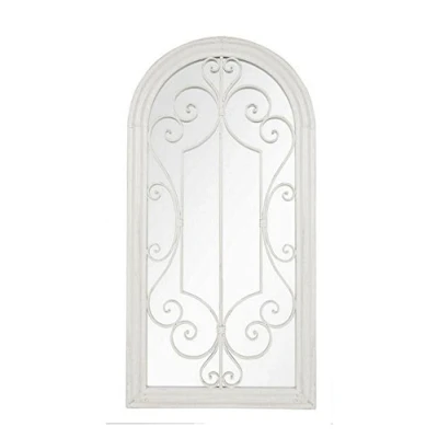 Durable steel and glass construction Waterproof backing Ornate design Antique white finish