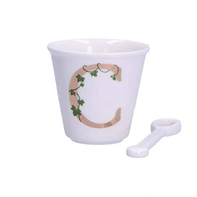 PRODUCT - Letter C Cup with Spoon Category - HomeFurniture, Kitchen PRODUCT CARE - Microwave and dishwasher safe; do not use abrasive sponges MATERIALS - Porcelain DIMENSIONS - 75 cc; Ø 6.7; H 6 cm