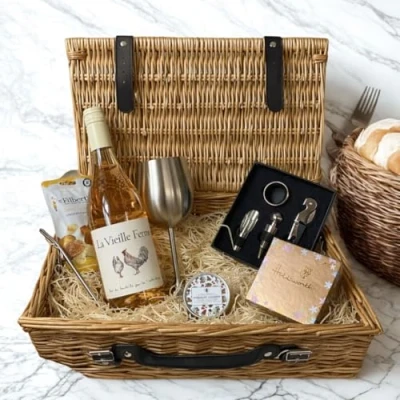 La Vieille Ferme Rose 16" Luxury Wine Gift Hamper with Chocolates and Accessories Fresh, Charming, and Exceptionally Curated Celebrate relaxed French elegance with the La Vieille Ferme Rosé 16" Luxury Wine Gift Hamper – 12.5% ABV (75cl). Thoughtfully assembled and beautifully presented, this generous hamper pairs a much-loved southern French rosé with indulgent treats and stylish accessories for a complete gifting experience. At its centre is a full-size 75cl bottle of La Vieille Ferme Rosé, crafted in the South of France and admired for its bright fruit character and easy-drinking charm. Light, crisp, and refreshingly dry, it’s a versatile rosé perfect for relaxed celebrations and thoughtful occasions alike. What’s Included: * 1 x 75cl La Vieille Ferme Rosé (12.5% ABV) * Wine Accessory Set – Essential tools for opening and serving with ease * Holdsworth Exquisite Cube Salted Caramel Chocolates – Rich sweetness with a refined savoury balance * Mr Filbert's Salted Caramel Chocolate & Nut Mix – A delicious sweet-and-savoury pairing * Metal Wine Glass – Durable and stylish for elegant presentation * Metal Straw – A sleek finishing touch * Victorian Candle Co Strawberry & Rhubarb Scented Candle – A fruity, uplifting fragrance that enhances the atmosphere Presented in a generous 16" luxury hamper, this set delivers flavour, indulgence, and ambience in one beautifully curated package. Tasting Notes (La Vieille Ferme Rosé) Delicate aromas of fresh strawberry, redcurrant, and citrus zest rise from the glass. The palate is light and lively, revealing crisp red berry fruit balanced by gentle acidity and subtle floral undertones. Refreshing and clean, it finishes with soft fruit persistence and a bright, summery lift. Perfect for Gifting Ideal for birthdays, thank-you gifts, housewarmings, or casual celebrations, the La Vieille Ferme Rosé Luxury Gift Hamper offers French charm, indulgence, and premium presentation in one stylish package. A fresh and approachable rosé gift that’s easy to enjoy and easy to love.
