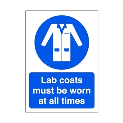 Lab coat must be worn at all times - safety sign - Indoor/outdoors Safety Sign to meet legal obligations and foster compliance. High-tack self-adhesive vinyl offers the optimal solution for indoor signage. Its easy application—simply peel off the backing and fix to your chosen location—makes it ideal for non-porous, flat, uneven, or curved surfaces. Measuring 150mm x 100mm, our sign ensures optimal visibility when mounted at eye level for viewing within 3 meters, effectively enhancing safety and communication on the road network This sign conforms to EN ISO 7010:2012 standards, featuring a centrally positioned black pictogram or text against a contrasting background, ensuring clear communication and adherence to safety regulations Experience peace of mind with our comprehensive 4-year warranty indoor signage. We stand by our commitment to quality, ensuring durability and reliability for every product