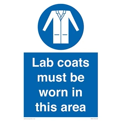 M906 : Wear a lab coat This sign is made from vinyl / sticker Air Release vinyl makes it easy to stick to flat, clean surfaces without bubbles. Not for rough, plastic or dusty surfaces. A4 portrait Sign Text: Lab coats must be Worn in this area