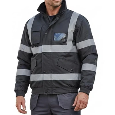 Mens Bomber Jacket with Reflective Tape WaterProof Coat keeps you dry and comfortable in wet weather conditions. Perfect size pocket to fit your mobile phone, keeping it safe and close to you. Functional D-Ring allowing you to attach any useful items that you may need, eg keys, tools etc. An essential feature for a number of fields, safely store your ID in a transparent pocket on your chest. Sturdy zip fastening with studed storm flap over prevents wind and rain from getting inside. A concealed hood within the collar makes this the perfect all weather coat, keeping you warm and dry.