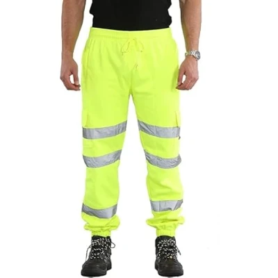 LABEL APPAREL Mens Hi Vis Fleece Cargo Combat Cuffed Joggers Trousers High Visibility Elasticated Waist Reflective Sweatpants Workwear Workout Safety Jogger Jogging Bottoms, Yellow, L