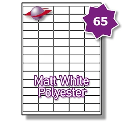 Label Planet® 65 Per Page/Sheet 5 Sheets (325 MINI MATT WHITE POLYESTER Sticky Labels) A4 Waterproof Permanent Plastic Printable Stickers, Laser Printers Only, 38.1x21.2mm LP65/38 MWP Outdoor/Marine