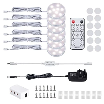 LABOREDUCER Under Cabinet Light Kitchen Kit,Dimmable Display Lighting Cupboard Lights with Remote Control,6 Pack Puck for Closet,Counter,Shelf,Wardrobe