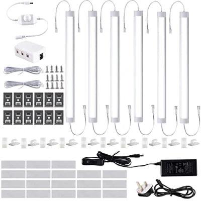 【Wonderful Under Cabinet Lighting Fixtures】 The under cupboard kitchen lights is 1800 lumens (Pack of 6 x11-inch light bars), warmlight white 6000K, it can illuminate any vignette-ting angle, No glare, no LED dots, no flicker.It’s easy to DIY them to work as kitchen under counter/cabinet lighting,bookshelf light,cupboard lighting,closet light, shelf lighting,workbench lights,storage cabinet lights,over desk lights, wardrobe lights,etc. 【Thin and Lightweight Kitchen Cabinet Lights】 The under cabinet kitchen lights unit is slim enough to be discreet once installed.With rotary switch dimmer,you can choose adjust any level of brightness(0% -100% ) you need.You can adjust the brightness to the level that is comfortable for your eyes,which is great.With memory function,no need to reset the brightness level after turn off the cabinet strip light,it will stay on the brightness level you set last time when power back on. 【Two Ways to Install the Light 】 No need to hire anyone to install the lights, just use the strong 3M Stickers, you can mount the LED lights anywhere and remove anytime you need; Or you can install by the Screw, all accessories are included packing.The unit is slim enough to be discreet once installed.The light for closet is the perfect,affordable answer to areas where you need more light but are on a budget. 【Energy Efficient and Convenience】All the cupboard light are 3W 24V to ensures a low wattage reduction, thus keeping the same brightness for linked strips from the first one to the last one.If you want to hardwired this cabinet strip lights set, you could cut the plug and wire to the electric outlet directly.Ultra slim aluminum alloy light bar produce very little heat.The color is best for detailed work and kitchen cooking,covering a wide range. 【Optional Linking Method and Easy to Install】The under cabinet lights include 6 LED strips,which you can link in parallel or in series. Allow you to install them anywhere and in any configuration you prefer.From there it is simply a matter of connecting the cupboard lights together and plugging them in.