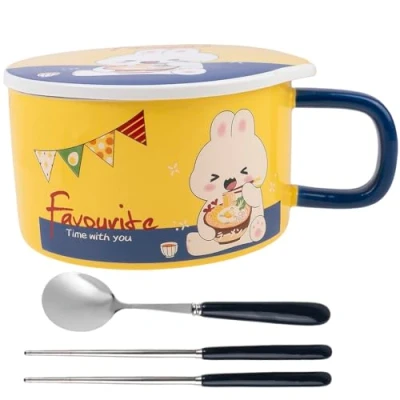 Material: High quality porcelain for durability and strength. Dimensions: Height 8.5 cm (without lid), top diameter 15 cm. 1000ml capacity Colour: yellow Noodle Bowl – Gift Idea Welcome to the wonderful world of indulgence with this most adorable noodle bowl you've ever seen! Get ready to immerse yourself in a culinary experience straight out of a fairy tale with our irresistibly rabbit design Japanese Noodle or Ramen Bowl.