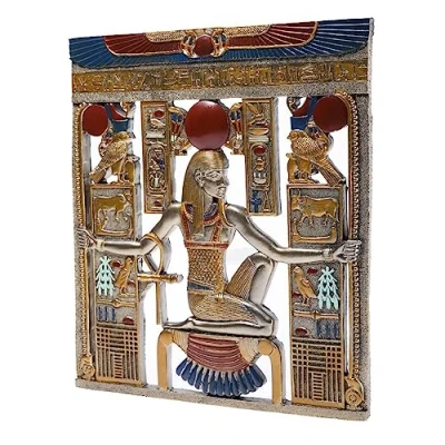 Egyptian fresco material: resin Egyptian fresco: 26.5 x 23.5 x 1 centimeters Egyptian fresco color: multi-coloured Egyptian decoration - gift idea Superb low-relief fresco openwork, depicting Pharaoh surrounded by many symbols of ancient Egypt. On this Egyptian bas-relief you will find some of the most famous symbols of this ancient civilization. This fresco will be a gift