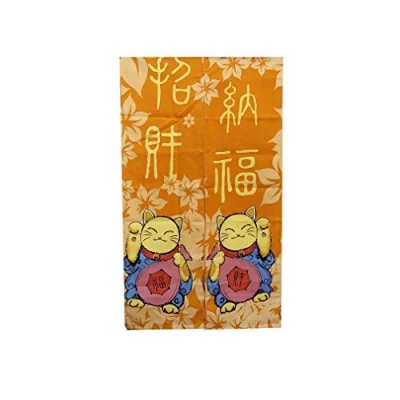Japanese north material: polyester. Japanese north dimensions: approx. 84 cm wide, 147 cm high. Japanese north colour: dominant orange, blue and pink. Japanese culture and tradition Traditional Japanese Noren, Orange, Blue and Pink, with a beautiful design of Maneki Neko.