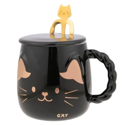 lachineuse Japanese Cat Mug with Lid and Spoon Black