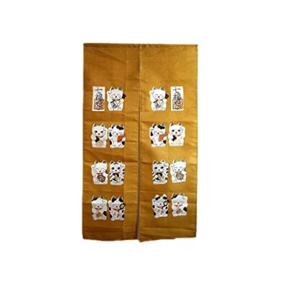 Maneki Neko Japanese Noren Material: Polyester Maneki Neko Japanese Noren Size: 84cm wide, 144cm high Maneki Neko Japanese noren colour: dominant golden yellow Japanese tradition and culture. Traditional Japanese Noren, golden yellow hue, with a decorative design of a real Japanese star: the Maneki Neko cat