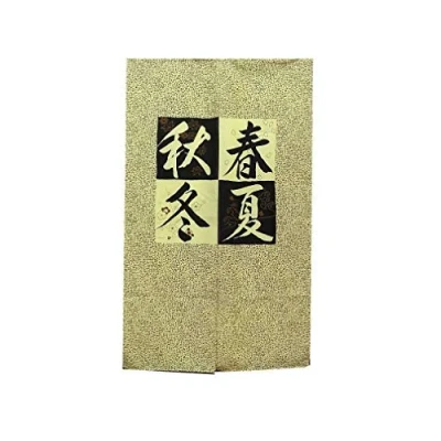 Material of the Japanese 4-season curtain: polyester. Size of the Japanese 4 Seasons Curtain: approx. 86 cm wide, 146 cm high 4-season Japanese curtain: Dominant yellow and black. Zen and Japanese decoration Traditional Japanese curtain, called NOREN, dominant yellow and black, with a decorative pattern of the ideograms of the 4 seasons in the form of ideograms, called KANJI in Japan.
